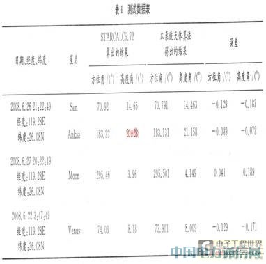对天体视位置计算算法及望远镜实际指向进行了测试。天体视位置算法的测试是选择有代表性的四个天体(太阳、大鸟六、月球、金星),通过与专业天文软件 STARCALC的计算结果进行比对,衡量计算误差的大小。望远镜实际指向的测试采用现场测量的方法。使用的主要测试工具为计算机、量角器等,测试数据如表1所示。