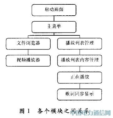 视频播放调用顺序依次是<启动画面>、< 主菜单>、<文件浏览器>、<视频播放器>;音频播放调用顺序依次是<启动画面>、< 主菜单>、<播放列表管理> 、<播放列表内容管理> 、<正在播放> 。在<正在播放>的界面上,点击相应的按钮就可以执行歌词同步显示功能。