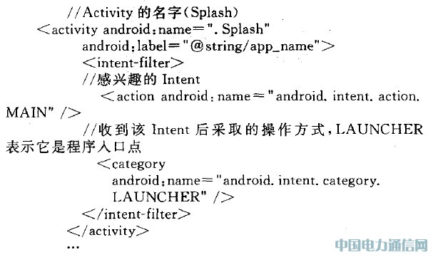 (3)Intent在Android中,每一个行为都可以抽象为一个Intent。可以简单地把Intent理解为一个包含了数据的消息。Intent可以用于启动一个Activity或者Service,可以用于进程间的通信。事实上,应用程序的启动也是通过Intent实现的。