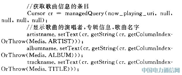 在Android的音乐库已经将歌曲的Idv2或Idv3标签进行解析,并将歌曲的相关信息(包括演唱者、流派、时长等)保存在媒体数据库中。只需要通过Con—tent providers对该数据库进行访问,就可以得到相关的信息并送显示。获取歌曲相关信息的程序源码如下: