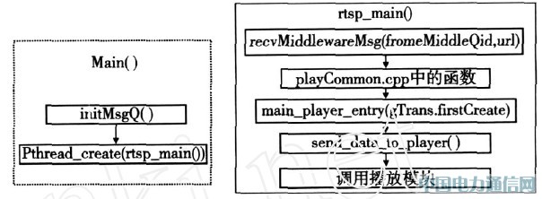为了衔接中间件、输模块和播放模块,设计了消息队列,以实现这3个模块间的数据通信。另外程序中还设计了 pt hread create 来创建线程 rt spmain(),实现程序的并发。IPTV 播放器的系统构架见图2。