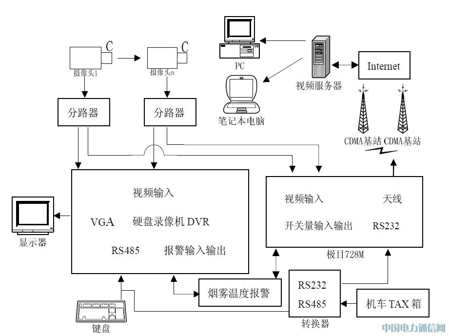硬盘录像机选用了深圳景阳公司的ADR 系列嵌入式数字硬盘录像机,它采用工业级专用数字信号处理器和嵌入式操作系统(Vxworks),可靠、稳定。它支持16 路视频输入,司机在驾驶室可通过RS485 接口接盘选择1 路或者多路观看。同时,它还支持多路报警量输入,可在机车关键部位安装温度、烟雾传感器,并接入硬盘录像机对应接口,在机车出现温度、烟雾异常情况时,硬盘录像机可发出警报,提醒司机注意。