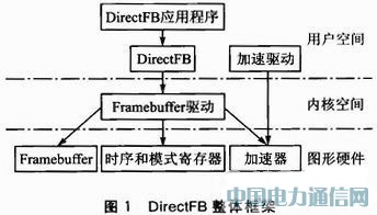 DirectFB必须通过Linux下Framebuffer驱动来访问硬件设备,它在Framebuffer的基础上提供了图形设备的加速、输入设备处理提取、透明窗口和多重显示层的功能。另外DirectFB设计之初就充分考虑了嵌入式系统的固有特性,体积小巧,资源消耗低。作为嵌入式系统中强大的图形处理库,DirectFB成为Linux下一代处理的一个新标准(CELF AVG1.0标准)。图1是DirectFB的整体框架。