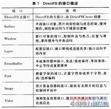 DirectFB提供了一套C接口来方便用户进行界面开发,例如IDirectFBSurface接口提供了对于文本、BILT、画线以及画矩形的操作。IDir ectFBFont接口提供了对字体的操作,而IDirectFBVideo接口提供了对多媒体进行播放控制的操作。表1对DirectFB接口进行了详细的描述。