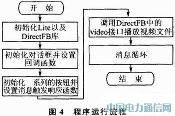 程序运行流程如图4所示。程序首先初始化Lite以及DirectFB库,然后初始化对话框并设置回调函数;接下来初始化一系列的按钮,例如播放、暂停、快进、声音、放大、缩小等,并设置消息触发响应函数。接着调用DirectFB接口中的video接口播放视频文件,然后会进入消息循环,来响应用户各种各样的按键消息。