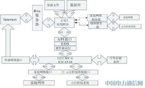 本系统的特点是基于嵌入式微处理器有限的系统资源之上,为客户提供视频服务。本系统采用的是"boa服务器+CGI+家庭网络服务器"的模式来实现对信息家电的控制。以及采用了"boa服务器+CGI+视频接收和控制模块(视频服务器)"的模式实现对视频数据的捕获、采集、发送等操作,并通过串行口通信方式对云台和镜头进行直接的控制,视频的接收问题一直以来是研究的重点,本系统采用在WEB页面中嵌入ActiveX控件的方式,由ActiveX控件完成视频数据的接收、解码和显示工作。这样做的好处是,不需对客户端做任何设置,就可以完成控件的自动下载和视频文件的实时播放。
