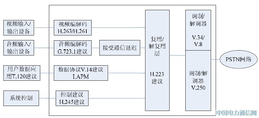 H.223 将视频码流、音频码流及控制数据码流复用,通过modem 调制到PSTN 网络上进行模拟线路的传输。