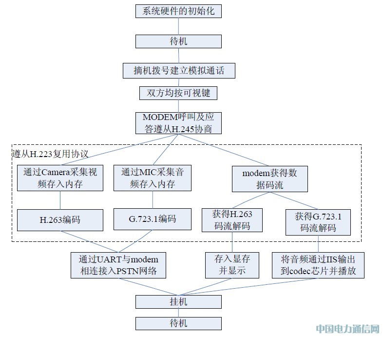 在硬件系统上电后,软件对硬件做初始化即进入待机状态。当摘机后,CPU 通过modem内置的模拟电话控制进行模拟通话。通话双方均按可视建,经过H.245 协议协商,开始建立可视。