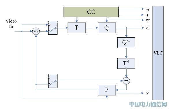 在如图-4 所示,H.263 编码器主要由4 部分组成:变换编码T,量化Q,预测P,熵编码VLC;对于实际应用的编码系统,码流控制CC 也必不可少的部分。图中有 2 个单刀双置开关,用于选择INTRA 和INTER.判断当前帧的类型,判断之后分成INTRA 和INTER的分支,分别进行处理。