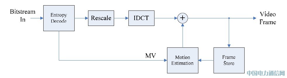 如图-6 所示,H.263 解码器与编码器对应,也有4 个主要部分:反熵编码,反量化(Scale),反DCT(IDCT),运动估计Motion Estimation.图2 简单示意了INTER 帧解码的过程,即IDCT 之后的结果都与运动估计结果相加,但在INTRA 帧时候,不需要与运动估计预测结果相加。可以看出, 解码器相对于编码器, 流程比较简单。