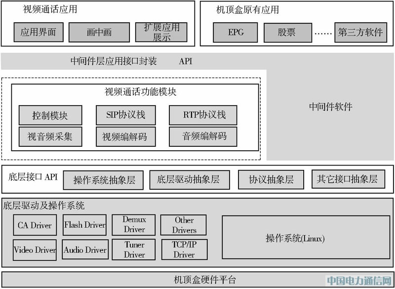 本文以STi7105 芯片为基础,介绍了尽量利用高清互动机顶盒的现有编解码能力实现视频通话功能;在此基础上可以向其他具有类似编解码能力芯片的机顶盒移植,比如STi7162、Hi3716 等;当需要更高的音视频编码质量时,也可以使用具有独立编码功能的摄像头、电话机等外设。随着高清机顶盒的普及,这种基于高清机顶盒的视频电话,使视频通信服务从高高在上的大客户业务转向普通家庭用户,也顺应了三网融合的时代要求。