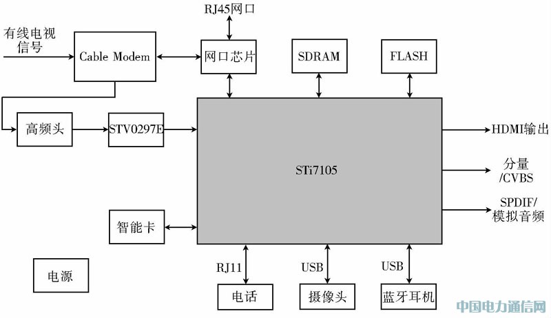 STi7105 高清机顶盒终端是一款完全符合DVBC标准的有线高清数字双向机顶盒,采用单片解码芯片STi7105 (ST40 CPU@450MHz 32K I 32K DCache),并配置64M FLASH 和256M SDRAM;内置Cable Modem 电路板,HFC 网络传来的有线数字电视信号先接入Cable Modem 电路板, 再环出接入STi7105 主电路板;双路网络RJ45 接口,一路为外置接口,一路接Cable Modem;双路USB2.0 高速接口,高清输出支持HDMI、YPbPr 高清接口,音频支持Dolby5.1 声道数字音频输出及PCM 解码输出,可以支持内置SATA 硬盘实现多媒体数据的本地录制播放时移,实现真正的家庭影院效果,同时支持网络下载上传业务,为用户提供全面的数字音视频增值服务。外接摄像头、电话机或者蓝牙耳机用于实现视频通话。结构示意图如图3 所示。