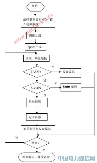 现在,基于MPEG-4 标准的应用大多为硬件方案,采用专门的MPEG-4 编码芯片,难以实现升级,灵活性也较差,而本文中使用软件方案,可按实际应用要求进行编码,易于以后的升级,具有很好的灵活性。本文中,实现的是自然视频编码,不涉及音频编码。软件设计的总体步骤是首先利用图像分割技术生VOP,接下来是Sprite 生成,最后是对各VOP 的编码。软件实现流程如图1 所示。下面对其中的关键技术作介绍,重点是以前的标准中所没有的:视频对象平面VOP(video object plane)的定义与生成,Sprite 生成与编码,形状、运动、纹理编码,可扩展编码。MPEG-4 中,VOP 分四种,I-VOP、P-VOP、B-VOP、S-VOP,对于普通视频对象,只涉及到前三种,S-VOP 指SpriteVOP。