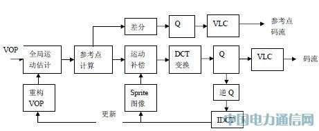 Sprite 编码是新一代的编码技术,它利用全局运动估计生成视频段背景的Sprite 图像(全景图),然后将这个Sprite 图像编码,以后各帧的背景编码都只是对该帧相对于Sprite 图像的运动参数进行编码。基于背景的平滑和纹理相关性大的特点,对Sprite 全景图的编码采用一种直接空间预测方法,基于篇幅限制,这里不作介绍,可参考[2]。Sprite 编码包括两部分,一是Sprite 的生成,使用全局运动估计来生成;二是Sprite 编码。Sprite 在最初的VOP 编码之前建立, MPEG-4标准中定义了两种类型的Sprite:静态Sprite 和动态Sprite。在这里选用动态Sprite,因此我们仅讨论动态Sprite 的生成与编码。
