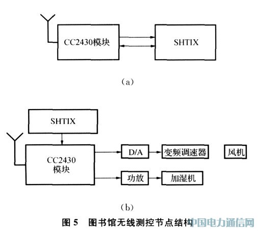 图书馆无线节点分别为测量节点和测量控制节点,如图5(a)、(b)所示。各书库中传感器测量出温湿度值,送给网络协调器,网络协调器将对测量进行分析,如果超越温湿度允许值范围,则通过网络中无线节点的控制节点启动变频调速控制空调或加湿机。