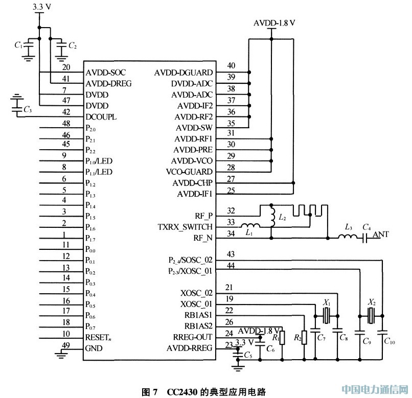 2)典型应用电路。CC2430的典型应用电路如图7所示。