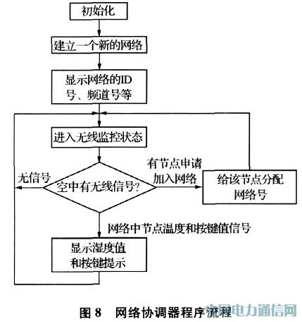 馆藏图书无线测控网络中的软件主要包括协议栈软件和应用软件。协议栈软件一般由芯片或Zigbee集成产商提供。系统基于Zigbee协议栈进行开发,应用开发主要针对具体应用开发出系统应用层软件程序。本应用的软件编程主要分为网络协调器应用软件和传感器测控应用软件。协调器负责管理网络、汇聚数据和提供与计算机管理软件的接口,传感器测控数据通过网络无线节点的控制节点控制是否启动变频调速控制空调或加湿机。本系统使用星形网络实现通信,网络配置一个网关(协调器)和多个传感器节点,在星形网络中所有的传感器节点只与网关通信,为实现这一功能,网关必须知道每个采集节点的网络地址,这需要每个节点在加入网络后把网络地址发送给网关,网关收到网络地址后建立地址表并存储,以便用户要求采集数据时依据地址表来采集每个传感器的数据。IEEE802.15.4MAC数据包最大长度为127字节,每个数据都由头字节和16CRC值组成,在数据传输中使用应答数据传输机制,设置ACK标志位为1的帧会被接收器应答,如果在一定期限内未收到应答,则证明采集节点发生错误。由CC2430元件为核心组成的Zigbee测控网络的协调器和控制节点的软件流程如图8、图9所示。