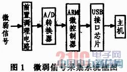 微弱信号采集系统的总体框图如图1所示,系统以S3C4510B为核心,主要包含前置调理电路和采集电路两大部分,主要由模拟信号检测、滤波放大、数据采集处理、信号通信传输电路组成。