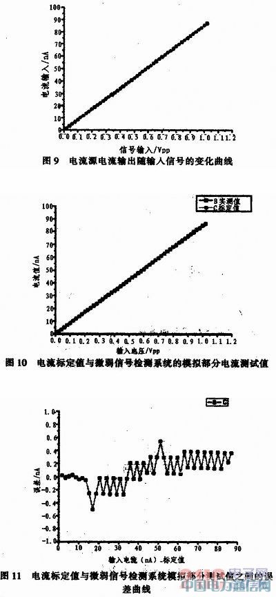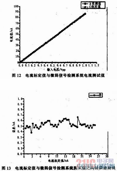 检测系统的模拟电路部分、数字部分和电脑界面整体构成一个模拟与数字的混合系统,即微弱信号检测系统。图12所示为电流标定值与微弱信号检测系统的电流测试值,其中标定值表示锁相放大器标定的电流源电流值,实测值表示由检测系统的测试电流源测试值。图13所示为电流标定值与微弱信号检测系统测试值之间的误差曲线,由均方差公式可得,电流精度为0.12nA。