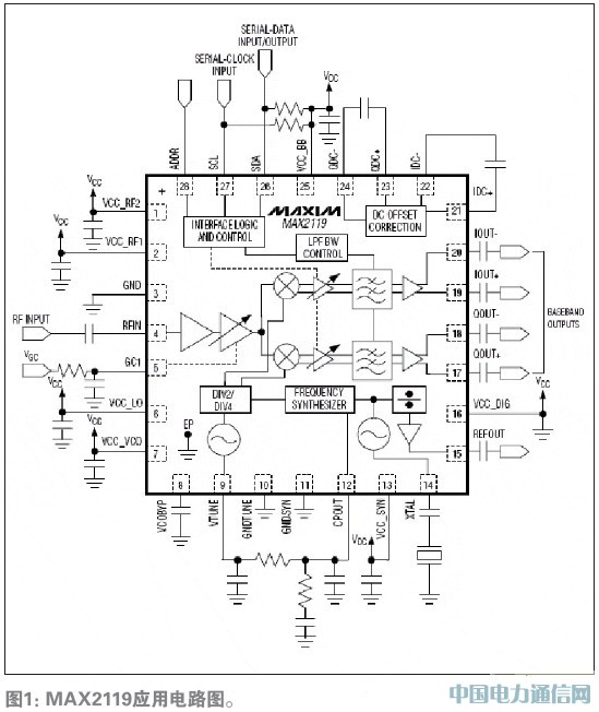 MAX2119外围仅需要一个晶体以及少量的电阻电容就可以组成一个完整ABS-S接收前端。可直接将ABS-S信号下变频到解调芯片所需要的I/Q信号。RF输入频率范围为950MHz至2150MHz,覆盖目前直播星的950MHz至1450MHz的主要工作频段。晶体的参考频率为12MHz至30MHz。