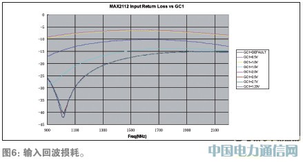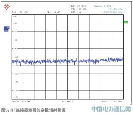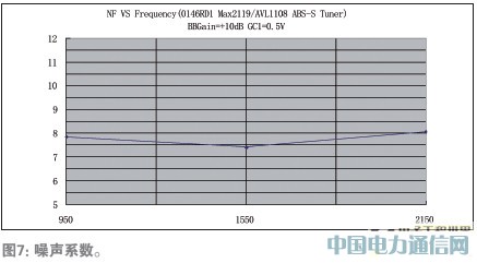 图5、图6、图7分别给出了杂散辐射、输入回波损耗和噪声系数指标的测试结果,图5所示杂散辐射低于-102dBm;图6所示输入回波损耗在950MHz-2150MHz段低于-6.2dB;图7所示为950MHz到2150MHz频段内的噪声系数,950MHz为7.85dB,2150MHz为8.07dB。基带增益设置为+10dB。