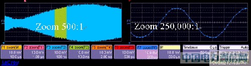八个窗口用不同的放大倍率显示同一个实时无线CDMA信号。要同时观察到信号特征和波形需要大量波形采集存储器,本图中的无线CDMA信号使用了1,000万个采集点,在最后一个缩放比例为250,000:1的视图中,可在CDMA信号上升和下降沿上见到实际数据采集点。正如图上所看到的,一次采集到的采样点足以精确地表现出实际信号形状。