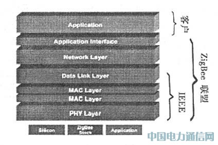 Zigbee ProtocoI Stack 体系结构如图1所示,它主要有5 层体系组成。 由Zigbee 联盟与IEEE 802. 15.4 的任务小组来共同担任标准的制定。 其中物理层、MAC 层标准主要由IEEE802. 15. 4 的任务小组完成。