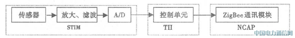 通过上述的描述,利用ZigBee 技术和IEEE1451. 2协议来构建的无线传感器,其基本结构如图2 所示: