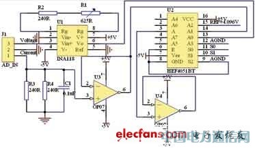 信号调理电路的功能是对前述4~20mA标准电流信号和0~60mV电压信号这两路输入信号进行放大处理,并通过多路开关实现对其选通输入,为后面的AD转换所用。