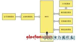由表中可以看出,热电偶的输出热电势基本上在0~60mV的范围内,因此,可以认为0~60mV具有较好的代表性,能够覆盖很多的应用环境,也应该作为系统输入的另一种信号类型。这样系统前端输入信号就有两类:4~20mA标准电流信号和0~60mV电压信号。这两类信号经过不同的调理电路调理为适合A/D芯片输入量程的电压信号后,经多路开关选通进行模数转换,然后经过MCU处理,最后可以与其他现场设备或监控中心进行通信。系统原理框架图见图1。