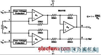 INA118通过在脚1~8脚之间外接电阻Rg来实现不同的增益,该增益可从1~1000不等。电阻Rg的大小由Rg=50kΩ/(G-1)决定,式中:G为增益。