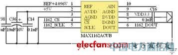从跟随器出来的模拟信号可能夹杂着噪声信号,会对转换精度产生影响,因此,在MAX1162前加入滤波电路,尽量减少输入噪声的影响。同时,为了减少对其他电路的影响,增加了0.1μF的去耦电容。电路原理图见图5。