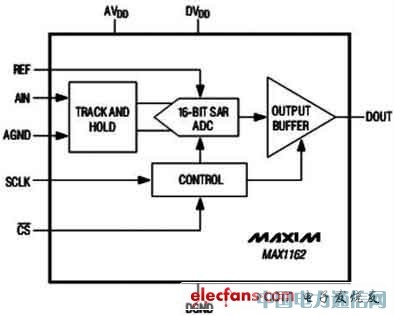MAX1162是一款低功耗、16位模数转换器(ADC),采用逐次逼近型ADC结构,具有自动关断、1.1μs快速唤醒和兼容于SPI/QSPI/MICROWIRE的高速接口。MAX1162工作于+5V单模拟电源,并且具有独立的数字电源引脚,允许芯片直接和+2.7~+5.25V的数字逻辑接口。