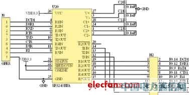 用MAX3243进行3.3V和RS-232电平转换。MAX3243是MAXIM公司推出的232电平转换芯片,其内部含有独立电荷泵,可以从3.0~5.5V的电源电压产生2Vcc的RS-232电平,使得其只需外接4个0.1μF的电容和一路 3.3V工作电源即可正常工作,大大简化了电路设计。其具有5个接收器和3个驱动器,符合标准MODEM信号方向的配置,适合MODEM连接。其电路原理图如图6。