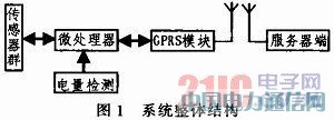 将该前端信号采集系统安装在动物身上,通过传感器群采集所需信息并传入微处理器,微处理器对各种信息整合打包之后定时发送给GPRS模块,启动GPRS模块接入Internet最终将信息送入网络监测中心。采用模块化设计思想,其整体结构主要包括前端信号采集调理模块、进行数据分析管理的控制处理模块、低电量报警模块以及进行无线传输的GPRS模块。其结构如图1所示。