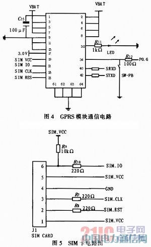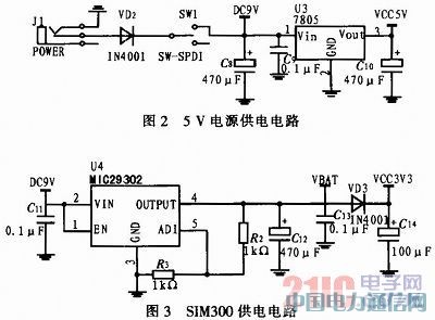 SIM卡与SIN300模块通过板对板连接器进行连接。目前,有6针和8针两种连接,该方案中采用的是6针连接器。其主要包括SIM卡的电源线、数据线、SIM卡时钟、复位线和状态线,SIM卡的供电电压由SIM300模块进行供电,根据通信公司提供的SIM卡模块自动进行选择。设计中,SIM卡上的RST、I/O、CLK、VCC和GND分别连接到SIM300的相应引脚,VPP悬空,其连接电路图如图5所示。