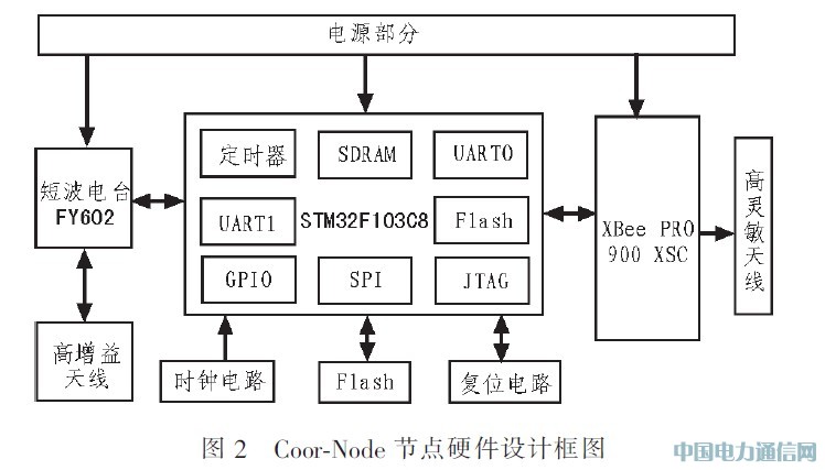 考虑到具体的硬件电路图设计比较繁杂,在此给出Coor-Node的节点的硬件设计框图,STM32F103C8是数传电台和ZigBee模块的中间层,通过两个串口分别连接数传电台和ZigBee,作为模拟电台数据和ZigBee数据的交互层,通过对其软件进行编程,实现两种网络数据的转化。