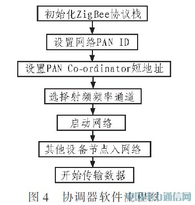 Coor-Node节点的XBee模块上的单片机编程。Coor-Node节点的XBee模块在构建的星型网络中作为协调器,协议栈初始化,创建PAN CO-ORDINATOR,选择PAN ID和Coor-Node的短地址,选择空闲信道,启动网络,转发数据。协调器软件流程图如图4所示。