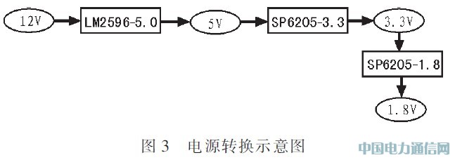 在Coor-Node电路板上因很多芯片的工作电压和电流不同,因此电源部分的设计非常关键。整个系统有外部的12 V的太阳蓄电池供电,而TM32F103C8的工作电压为1.8 V,I/O工作电压为3.3 V,数传电台的工作电压为4.5~5.5 V,ZigBee模块的供电电压为3.3 V,因此选择LM2576-5.0,MIC29302及AMS1117系列的电压转换芯片,得到各芯片相应的工作电压。电源部分的设计思想如图3所示。