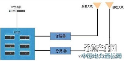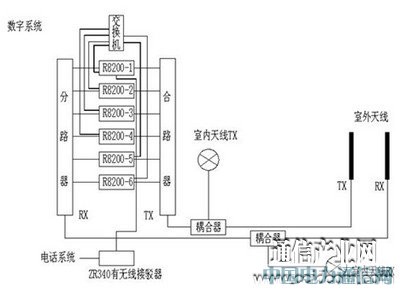 本工程规划使用6台XiR R8200数字中继台,通过6根网线与交换机连接,构成12个逻辑信道池。通过合路器将发信端合路,分路器将收信端分路,室内天线、室外天线分为两路分别完成发射和接收信号。