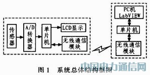 如图1所示,监测系统由单片机监测终端和监测中心PC机组成。其中单片机监测终端由传感器数据采集模块、A/D转换模块、LCD显示模块、无线通信模块等构成。单片机监测终端既可以独立完成各种信息的采集、预处理及显示任务,又能向监测中心PC机传送所采集到的数据信息。监测中心PC机主要完成数据存储、数据显示、数据管理、数据查询和历史资料统计分析等功能。
