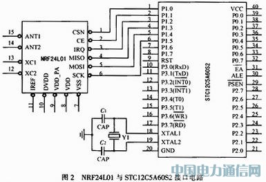 无线收发模块NRF24L01与单片机STC12C5A60S2/AD/PWM的接口连接如图2所示。NRF24L01的MISO脚连接单片机的P1.3脚,其功能是NRF 24L01将接收到的数据解调后输出到单片机中。NRF24L01的MOSI脚连接单片机的P1.4脚,其功能是单片机将准备发送的数据传输到NRF24L0 1,经过调制后发送到上位PC机。NRF24L01的CE脚连接单片机的P1.1脚,CE为使能发射或接收引脚。在CSN为低的情况下,CE协同NRF24L01的CONFIG寄存器共同决定NRF24L01的状态。