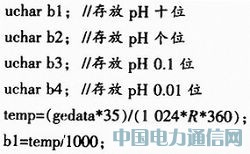 pH的采集选用上海力琼电子有限公司生产的PHG-96FS型测试仪,其输出电流为I=pHx(8/7)+4.00 mA。通过电流/电压转换器将pH测试仪输出的电流转化为对应的电压接到单片机的P1口,将P1口设置为AD模式,可得模拟输入电压Vin=pHx[(8/7+4)]xRx1 000。然后,根据A/D模拟输入量Vin与数字量输出D的关系D=Vinx1 024/Vref,Vref为单片机A/D模块的参考电压,其值为Vref=5 V,最后得到pH的计算式为pH= 35xD/(1 024xRx36 000)。其部分程序如下:
