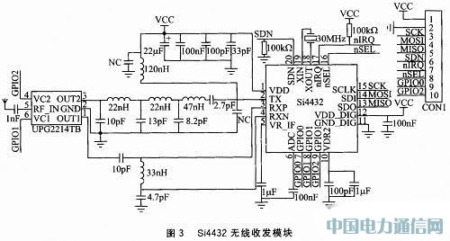 为了达到较好的通信效果,Si4432的接收低噪声放大器匹配电路和发射功率放大器匹配电路的阻容参数,应严格按照数据手册提供的参数选型。前端的分集式电路采用UPG2214TB,其VC1脚和VC2脚分别连接Si4432的GPIO1和GPIO2.通过这款交叉开关实现分集式天线发送和接收通道的自动切换。