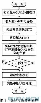 无线发送程序流程如图4所示。完成C8051F310、SPI和Si4432的初始化后,配置寄存器写入相应的初始化RF控制字。接下来,通过配置Si4432的寄存器3eh来设置包的长度,通过SPI连续写寄存器7fh,往TX FIFO里写入需要发送的数据。然后打开“发送完中断允许”标志,将其他中断都禁止。当有数据包发送完时,引脚nIRQ会被拉低以产生一个低电平从而通知C8051F310数据包已发送完毕。完成中断使能后,使能发送功能,数据开始发送。等待nIRQ引脚因中断产生而使电平拉低,当nIRQ引脚变为低时读取中断状态并拉高nIRQ,否则继续等待。一次数据发送成功后,进入下一次数据循环发送状态。