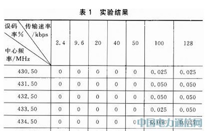 为验证本无线射频收发系统设计的可靠性,进行了7组“发射模块-接收模块”通信实验。在空旷地通信距离约为1 600 m时,7组“发射模块-接收模块”分别工作在430.50 MHz、431.50 MHz、432.50 MHz等7个中心频率上,带宽均取112.8 kHz,频率偏移取±25 kHz,发送4 000个数据包,实验结果如表1所列。