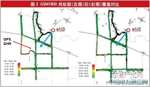基于上述方案的单站TD-LTE/GSM共站实测结果如图2、3所示。其中eNB在图中红圈位置,小区指向蓝色箭头方向。站高大约30米。