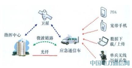 应急通信指挥车是现场通信的核心,与PDA、手提电脑、单兵视频采集等终端采用4G 宽带无线技术进行通信,与指挥中心通过卫星、光纤或微波链路建立连接。
