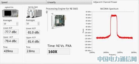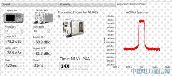 PXA还有一个可选的模式,即无噪声校正的快速ACPR选项。使用快速ACPR选项,会损失一些动态范围。NI PXIe-5665则无此限制,所有的测量均通过噪声校正,并对速度进行优化。