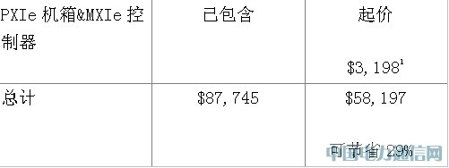 在自动化测试系统中,PXI机箱和MXI控制器的花费通常被系统中的所有仪器均摊。例如,如果一个测试系统中包含两个NI PXIe-5665矢量信号分析仪,并插在一个PXIe机箱中,则机箱和控制器的费用只会发生一次,因此总的投入要少于2 x $58,597。然而,如果一个测试系统中包含两套PXA,则投入为2 x $87,745。